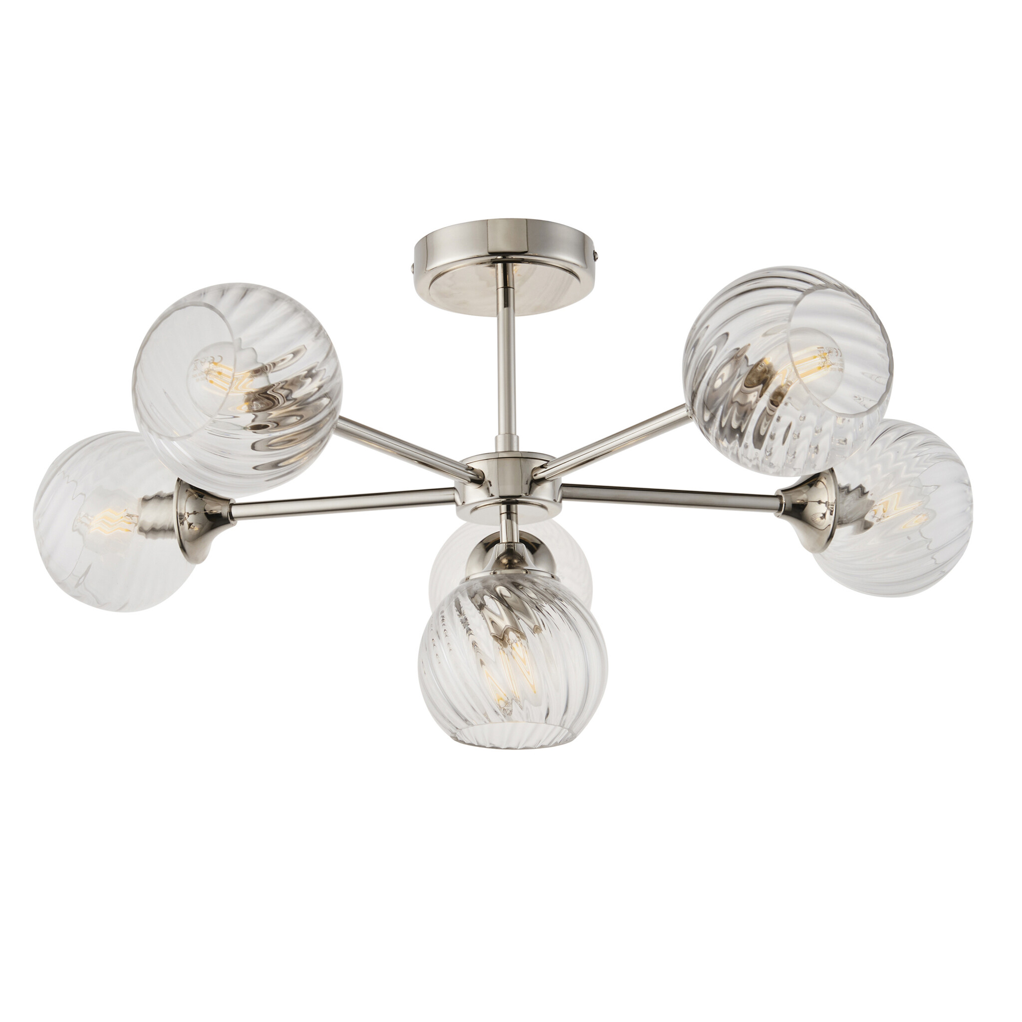 This 6 light semi flush is perfect for casting light around the room and is finished in a stunning bright nickel plate. This bright nickel finish is just stunning, the perfect partner to the clear spiral patterned glass shades.