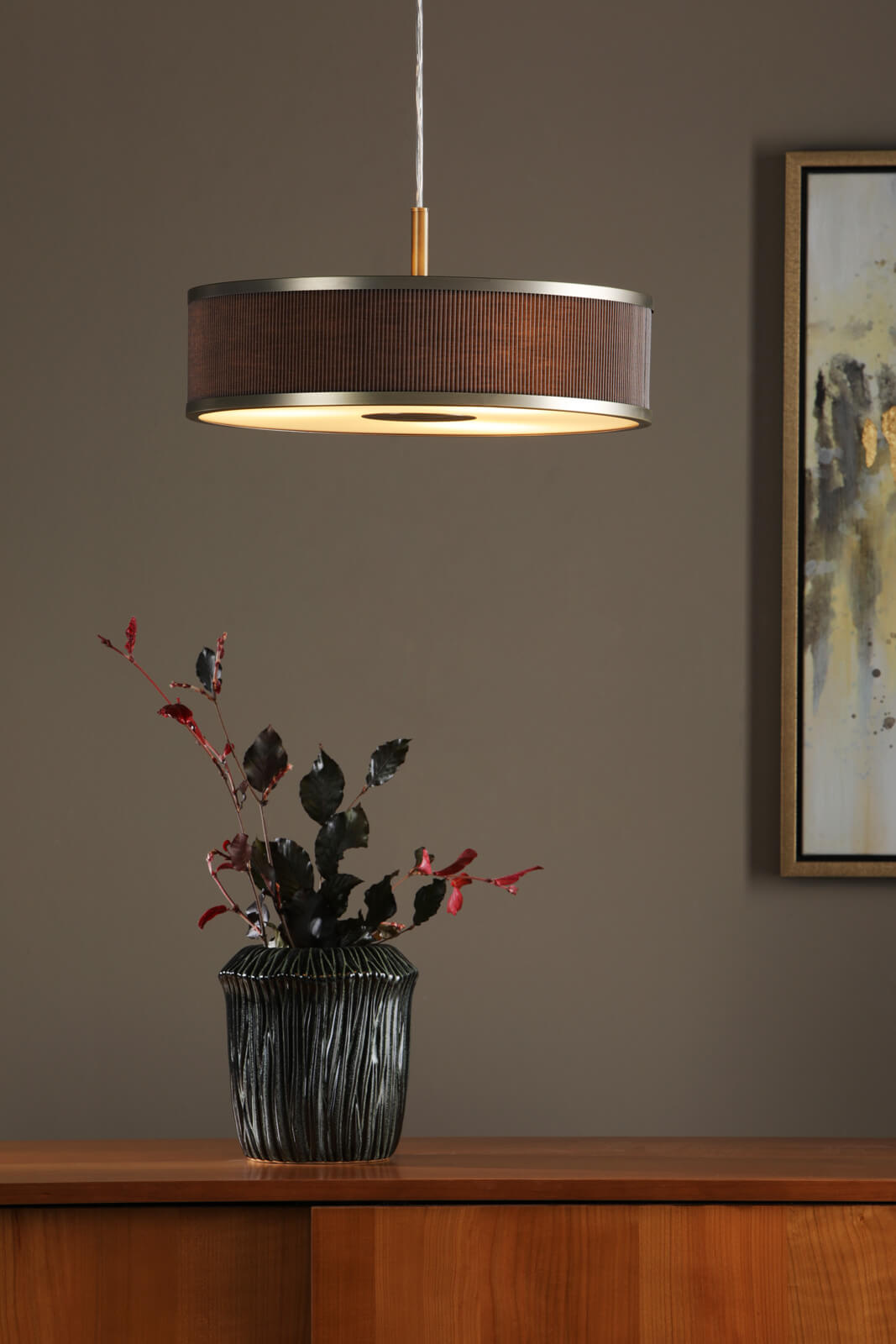 This mid-sized pendant light balances warmth and structure, ideal for bedrooms or smaller dining tables and living rooms. The fabric drum shade and brass accents bring a tactile softness, while the frosted diffuser ensures even light both above and below. Versatile enough for compact or layered interiors.