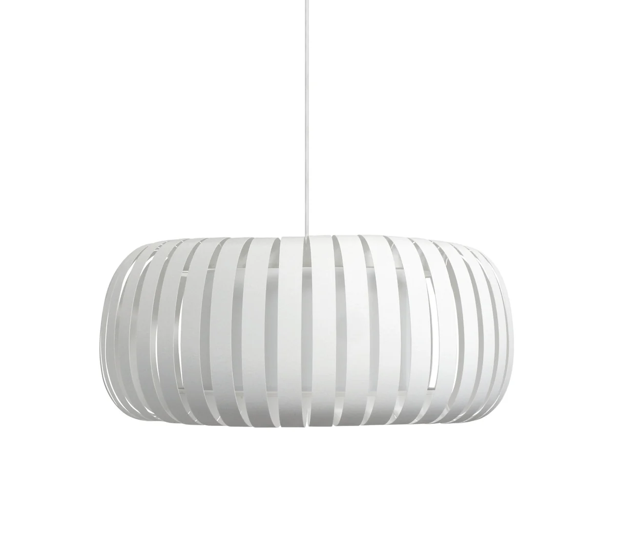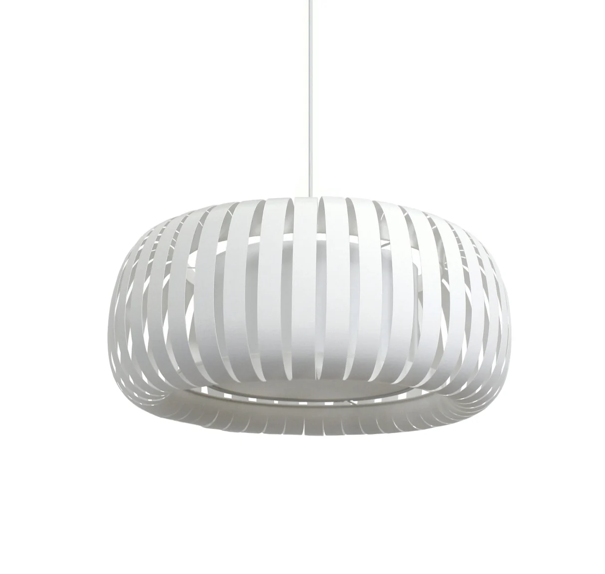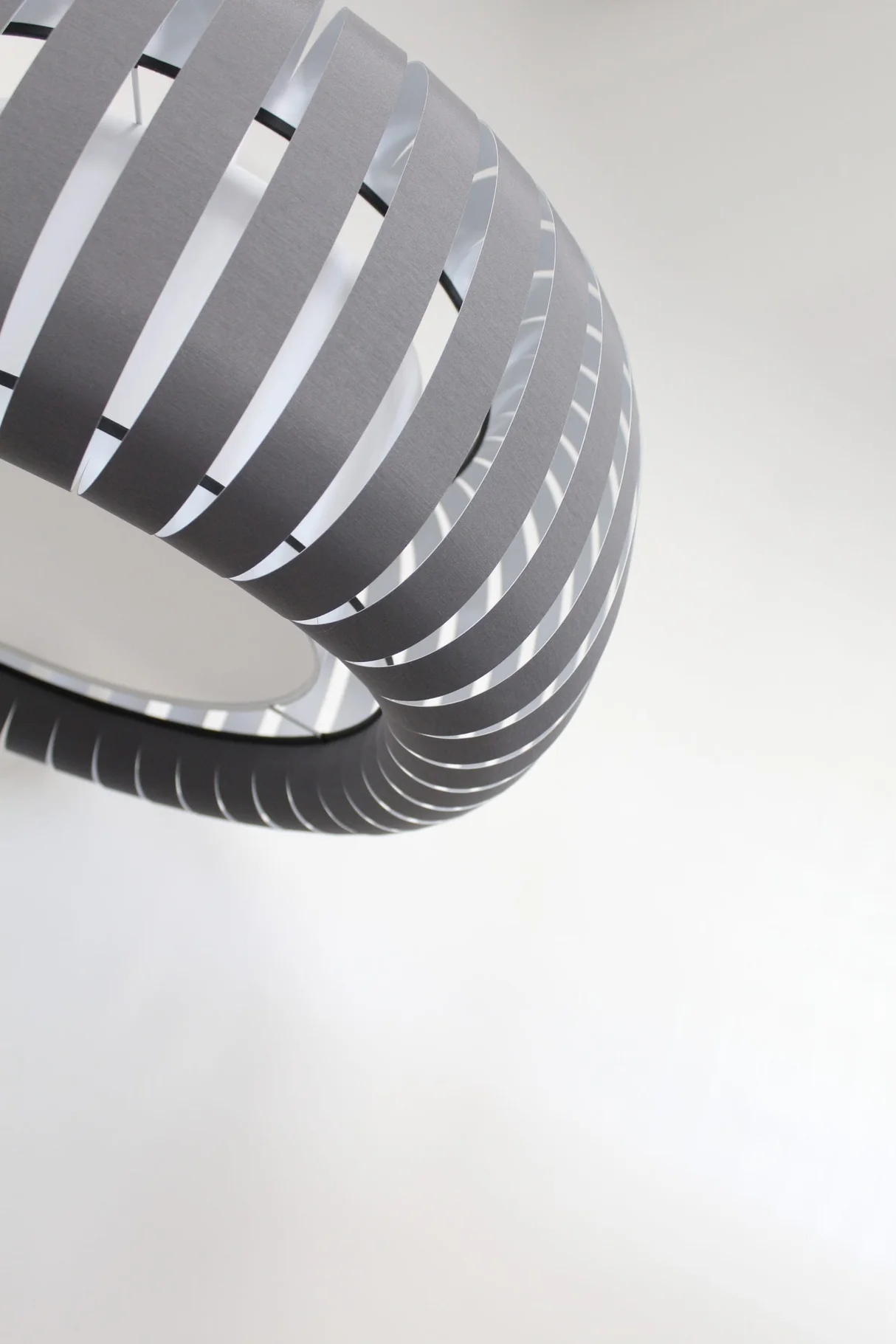 Crafted from fabric bands layered around a polycarbonate diffuser, Luna plays with light and shadow in a beautifully fluid form—offering ambient glow above and below.