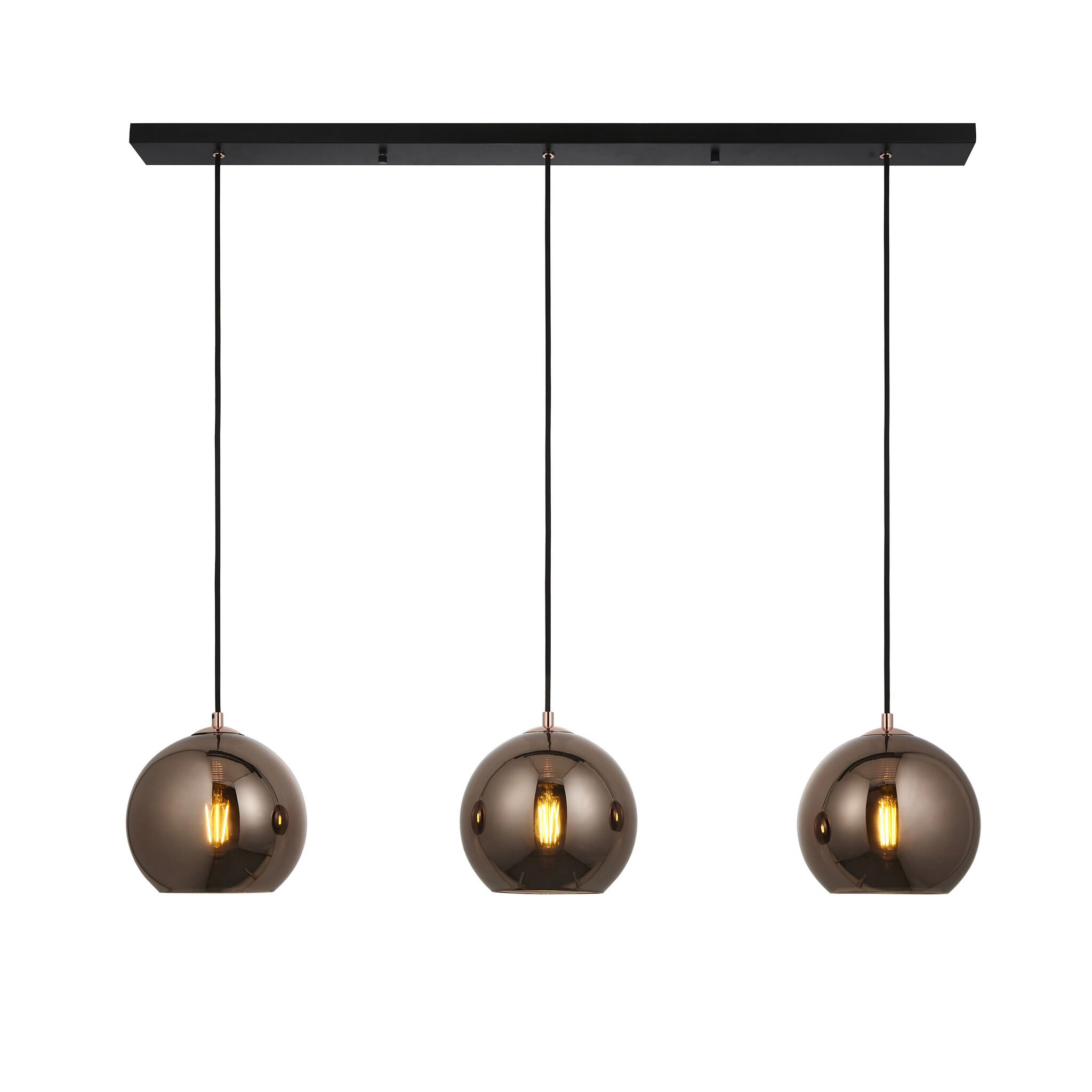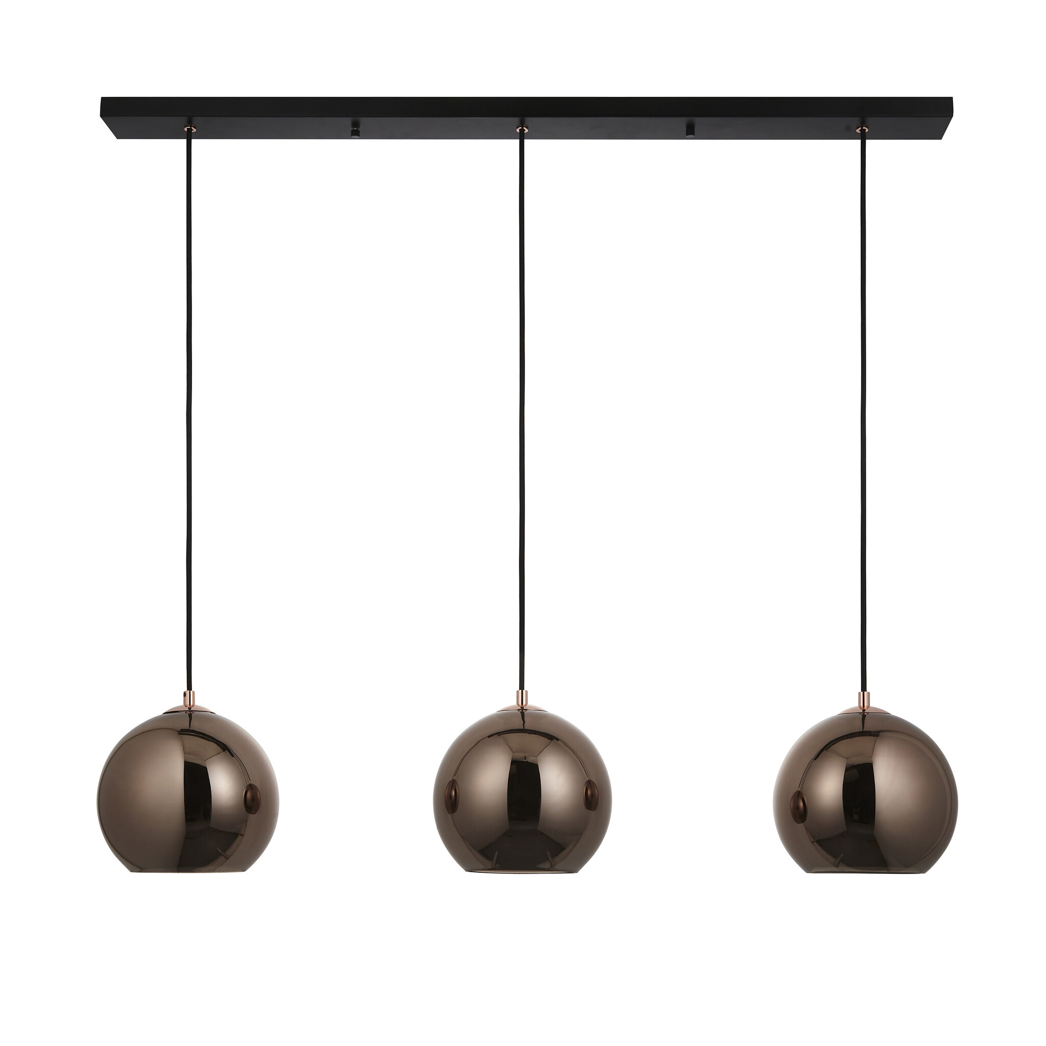 Bring warm copper tones into any room with this stunning minimalist glass globe copper bar pendant light. The mirrored shades hang from a matt black cable which is height adjustable on installation. Create a modern contemporary feel with this dimmable linear pendant light.