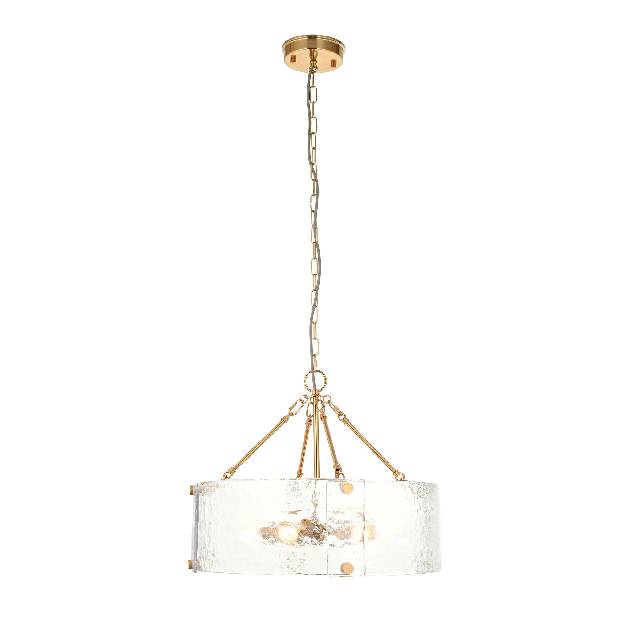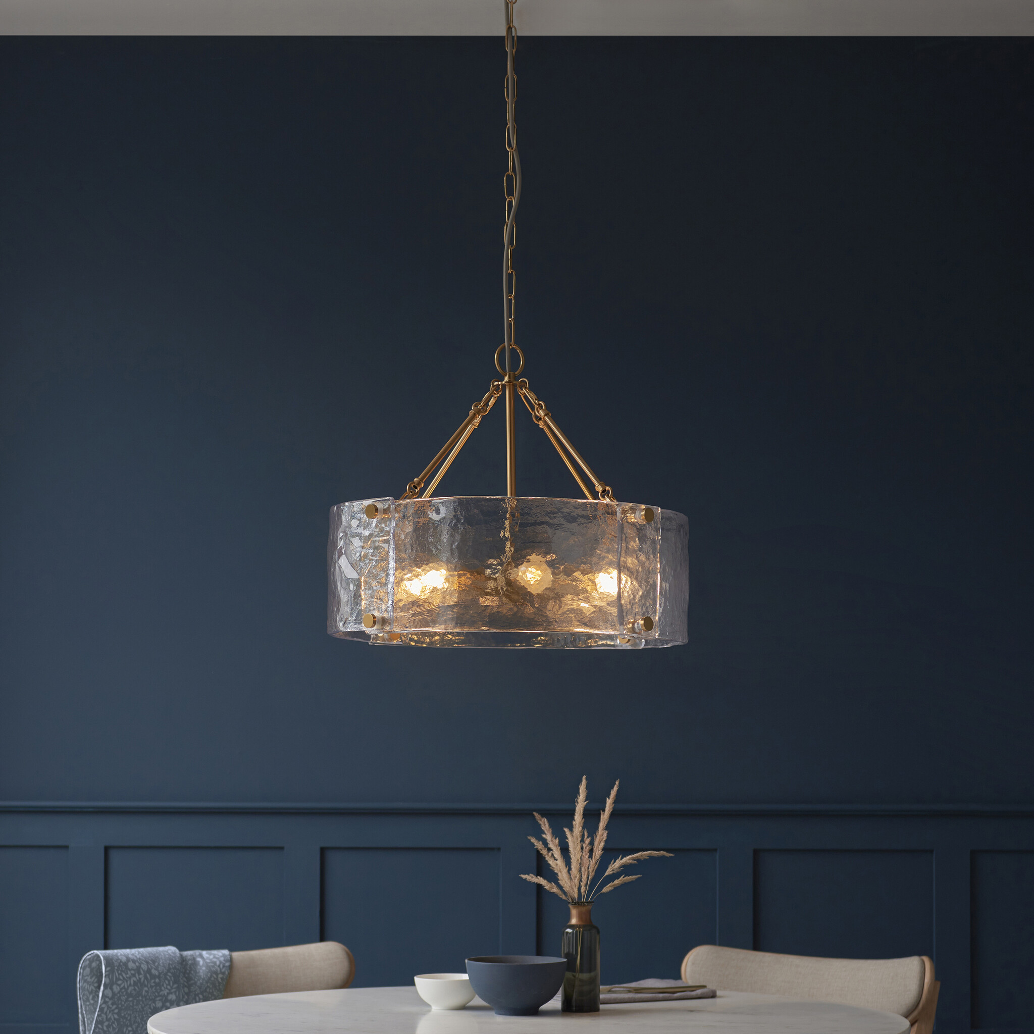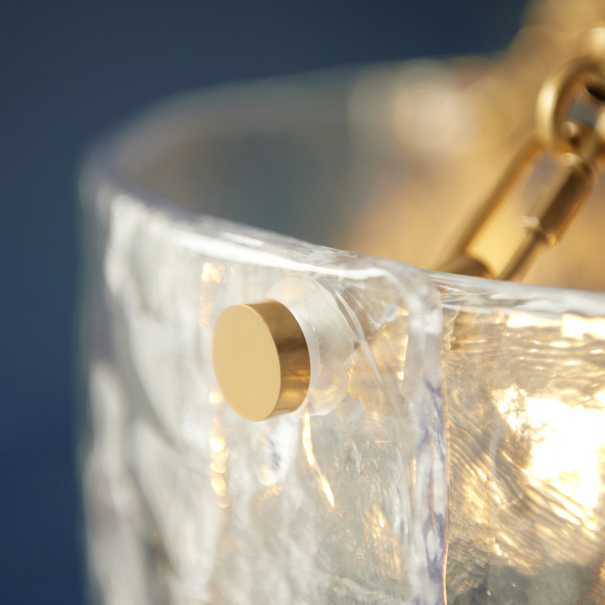 This unique 6-light pendant blends contemporary form with handcrafted detail, celebrating organic texture and understated luxury. Thick, handmade curved glass panels form a cylindrical shade, each one individually crafted to catch and soften the light with natural variation and character.