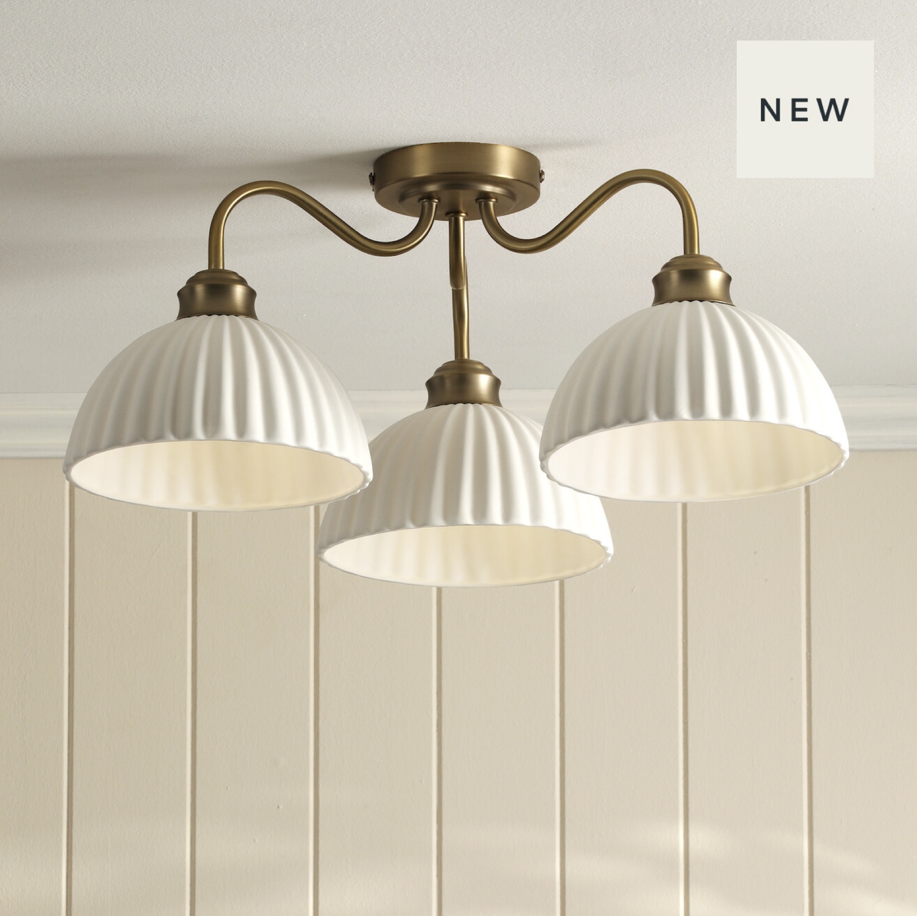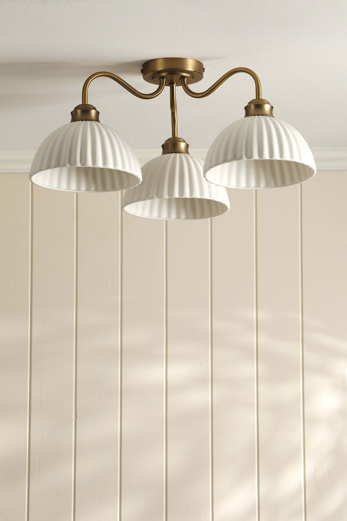 Leaning into Laura Ashley’s distinctive style, the Durford Semi-Flush Ceiling Light blends classic and modern cues with its three-light design and antique brass finish. The ribbed ceramic shades offer an elegant finish and a warm diffusion of light, while the semi-flush profile makes it an ideal choice for low ceilings. Perfect for bringing effortless ambience to intimate spaces.