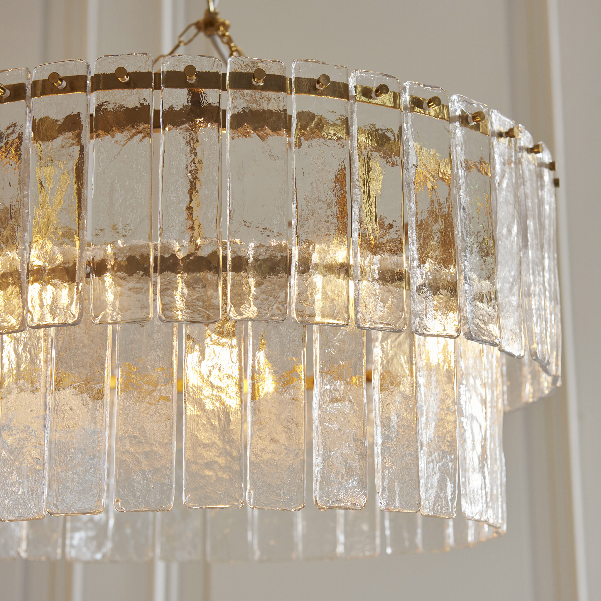 Gracefully layered and meticulously crafted, inspired by vintage Venetian art lighting, the Liora Venetian Style Glass Chandelier (5 Light - Large) showcases rows of handmade textured glass panels that gently cascade in two tiers, creating a luminous and sculptural centrepiece.