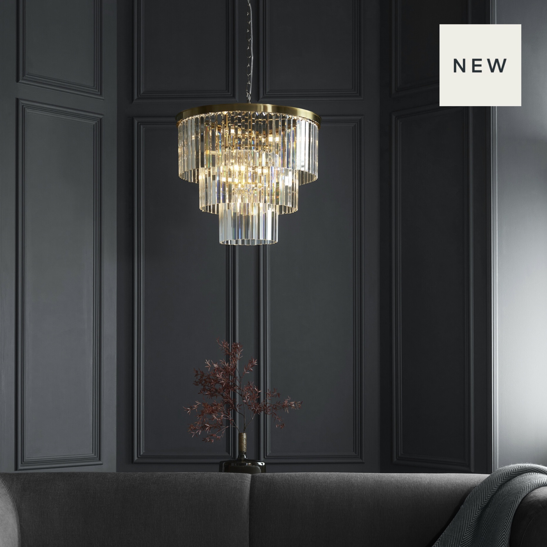 Opulent and eye-catching, the Lumara Large Chandelier is a true statement piece that brings refined glamour to interiors. Cascading tiers of angled crystal lozenges shimmer beautifully from a shaped metal band in a lustrous brushed brass finish, creating a striking balance of structure and fluidity.