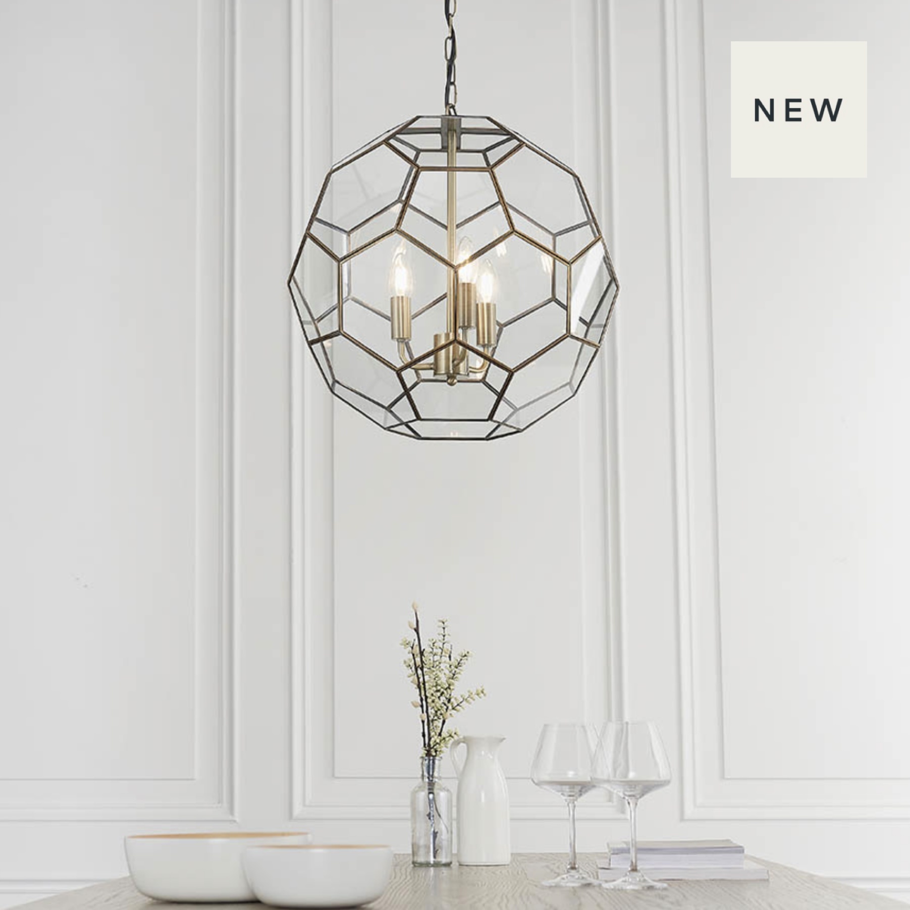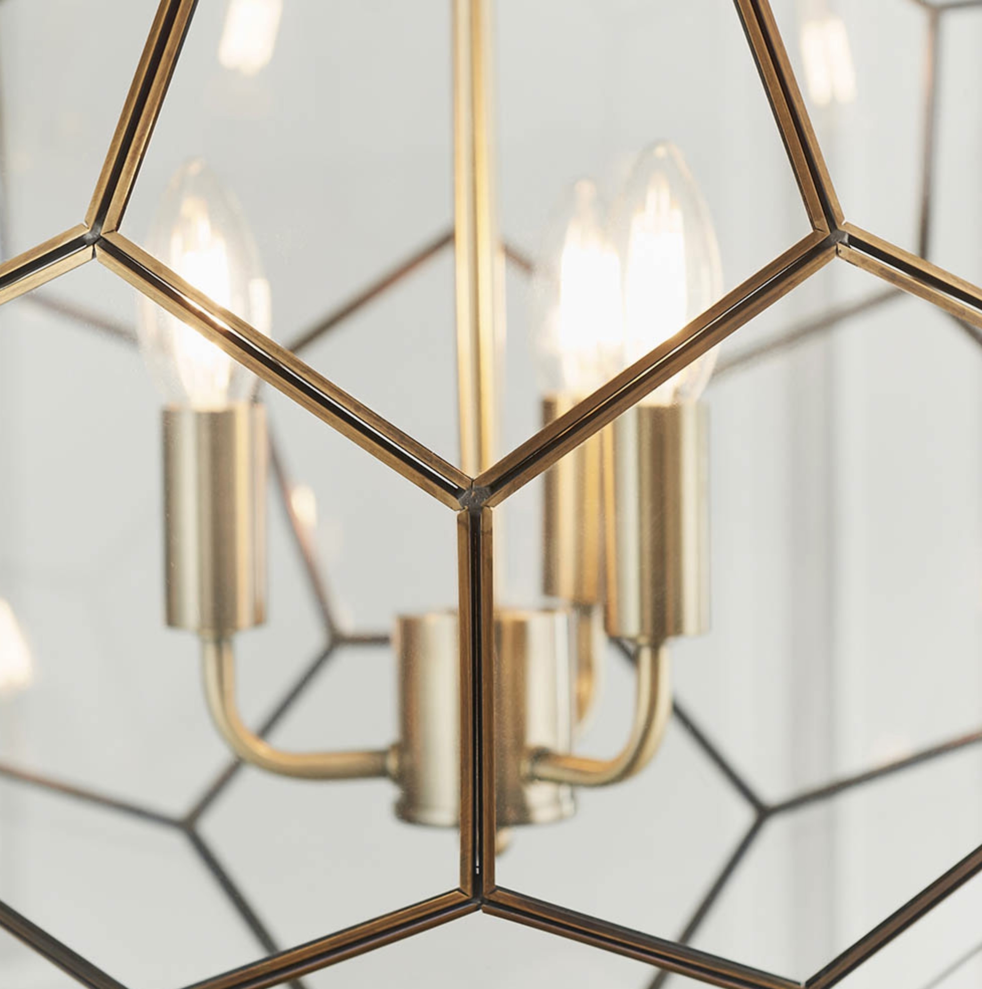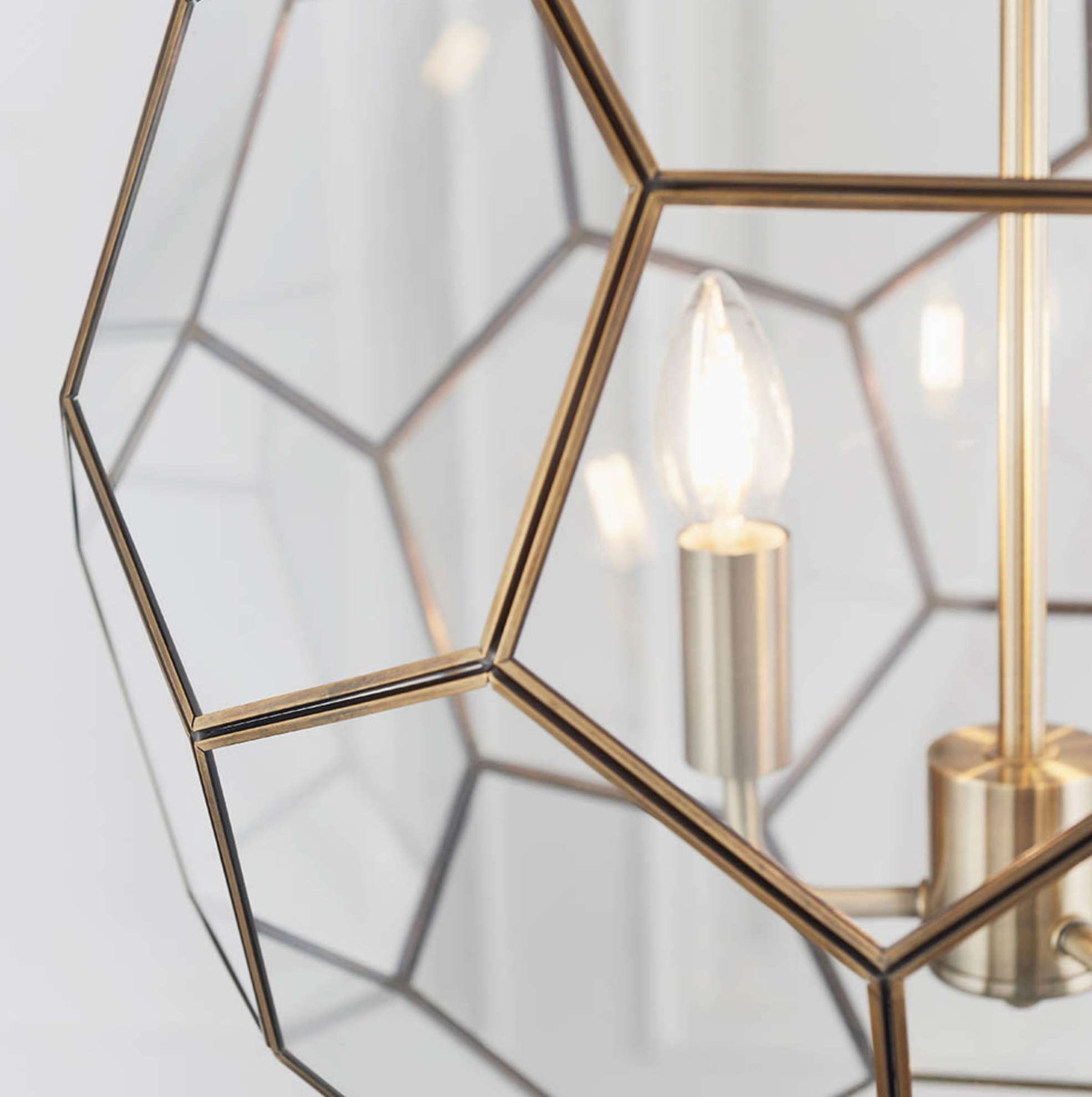 Bold, sculptural, and timelessly elegant, The Lyra brings geometric beauty to your interior with its statement hexagonal glass structure framed in antique brass. Designed to elevate contemporary and classic settings alike, this striking modern lantern pendant makes a refined centrepiece over a dining room table, in a hallway, or as a standout living room ceiling light.