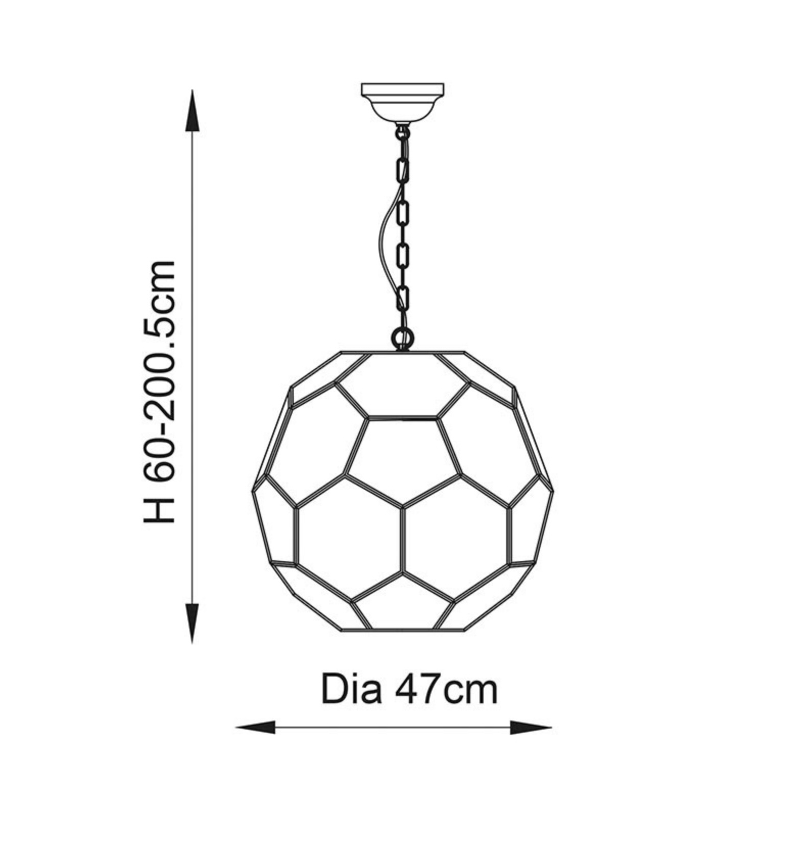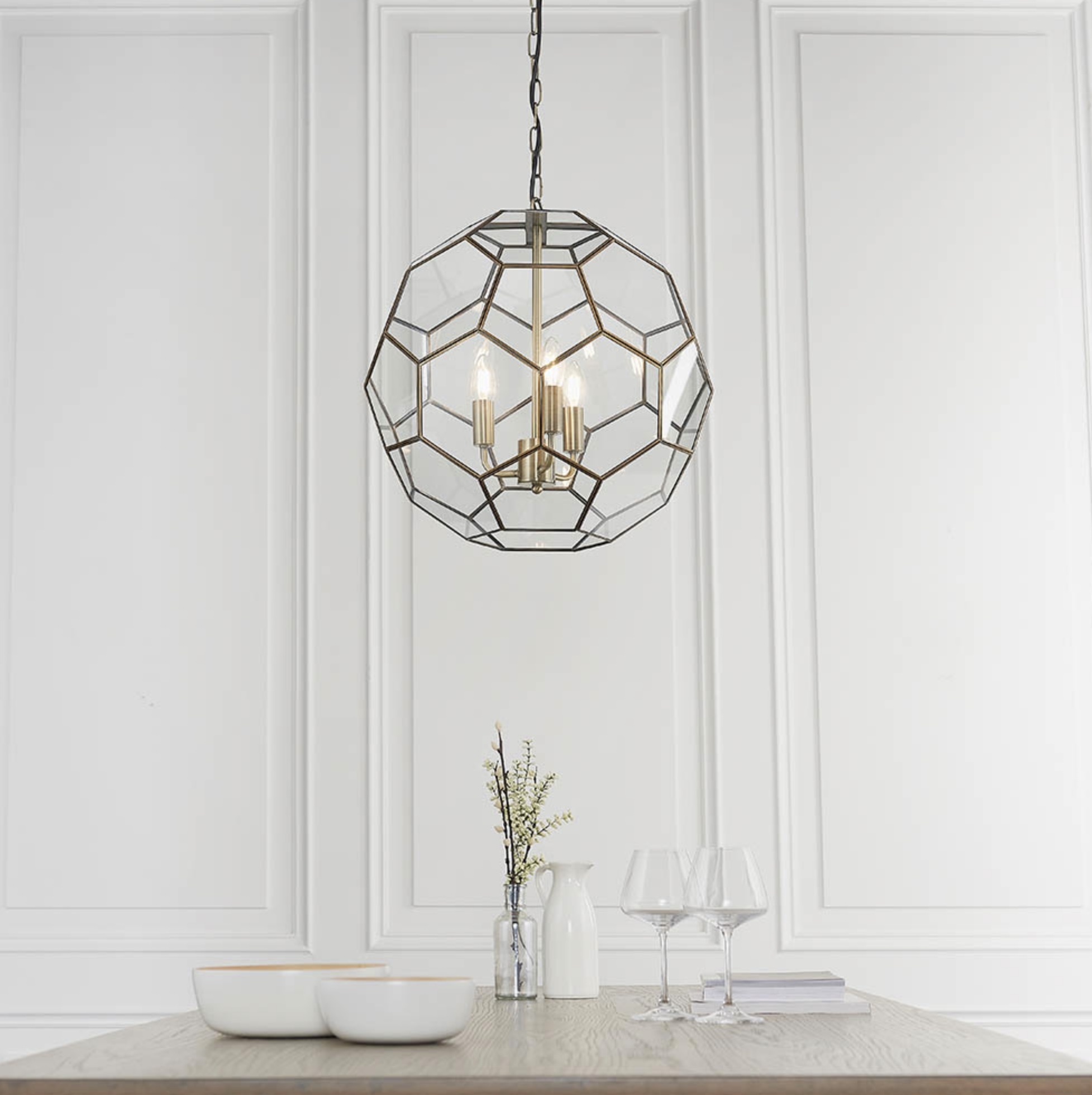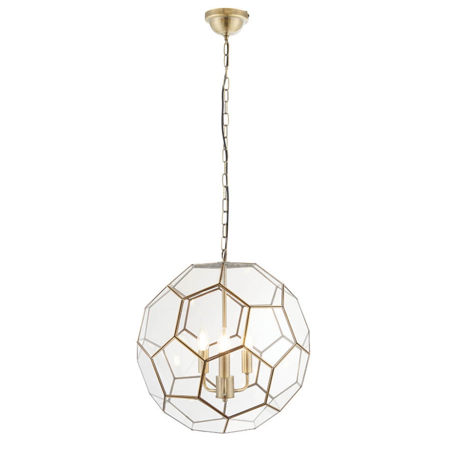 The 3-light pendant casts a warm, layered glow through its faceted glass panels, while the antique brass detailing adds richness and sophistication. Suspended on a decorative chain with adjustable height (60–200.5cm), it suits both standard and tall ceilings, and is fully dimmable for atmospheric control.