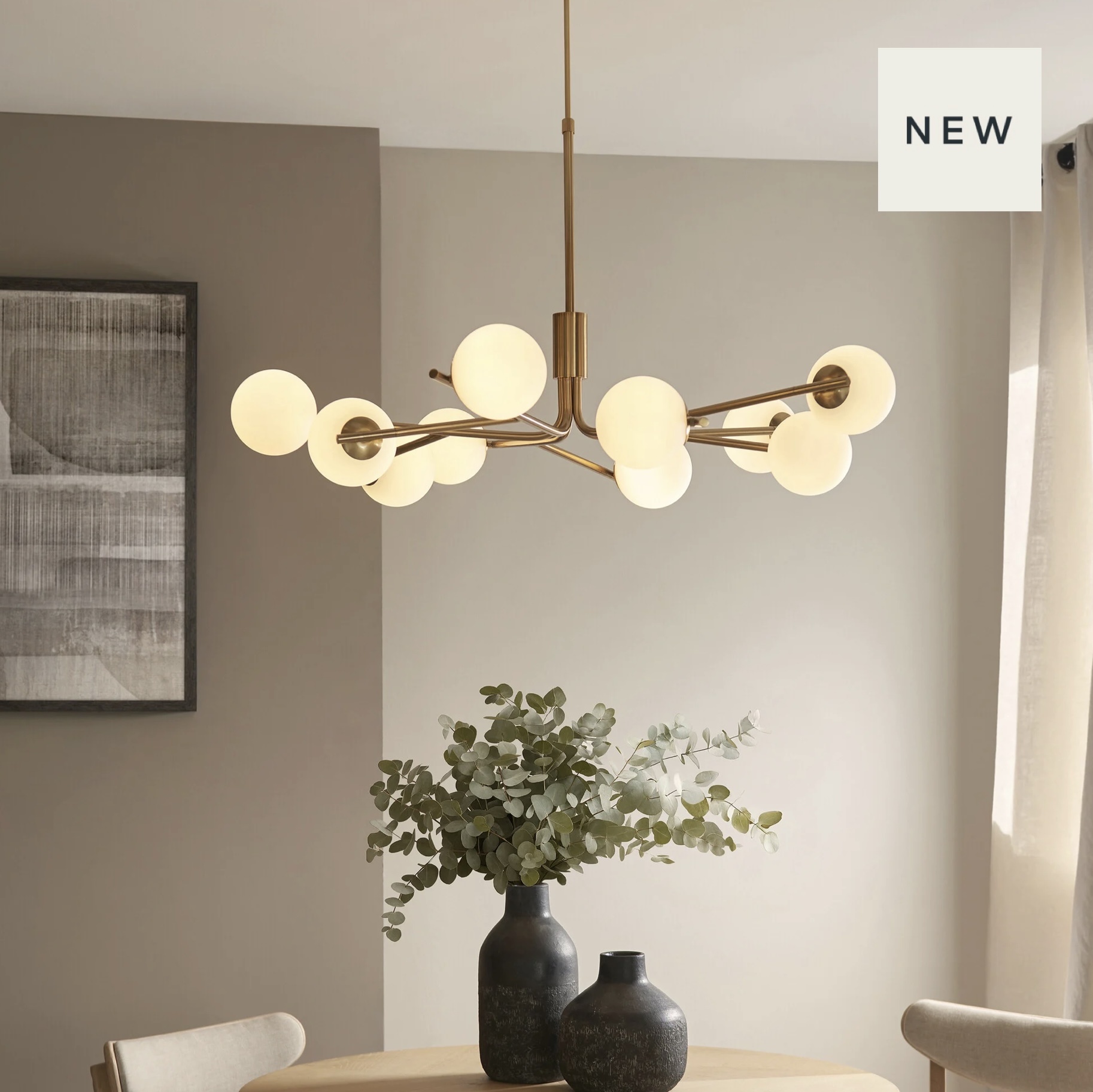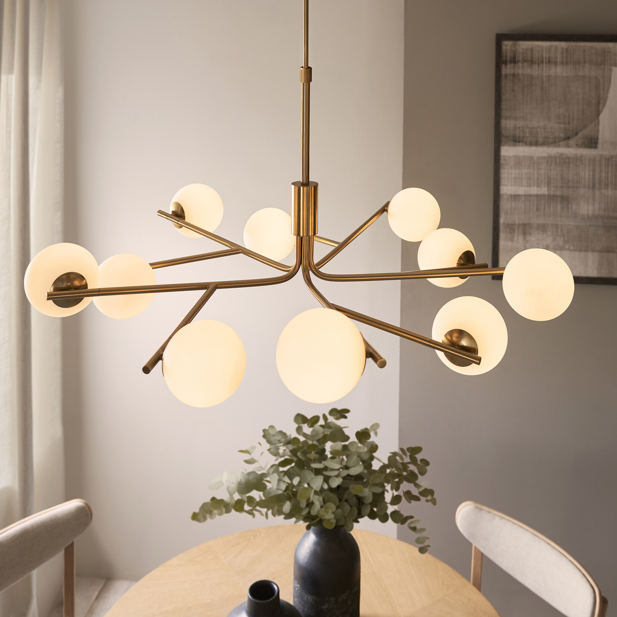 Featuring ten gracefully arranged matt opal glass spheres set against brushed aged brass metalwork, this piece perfectly balances warmth and sophistication.