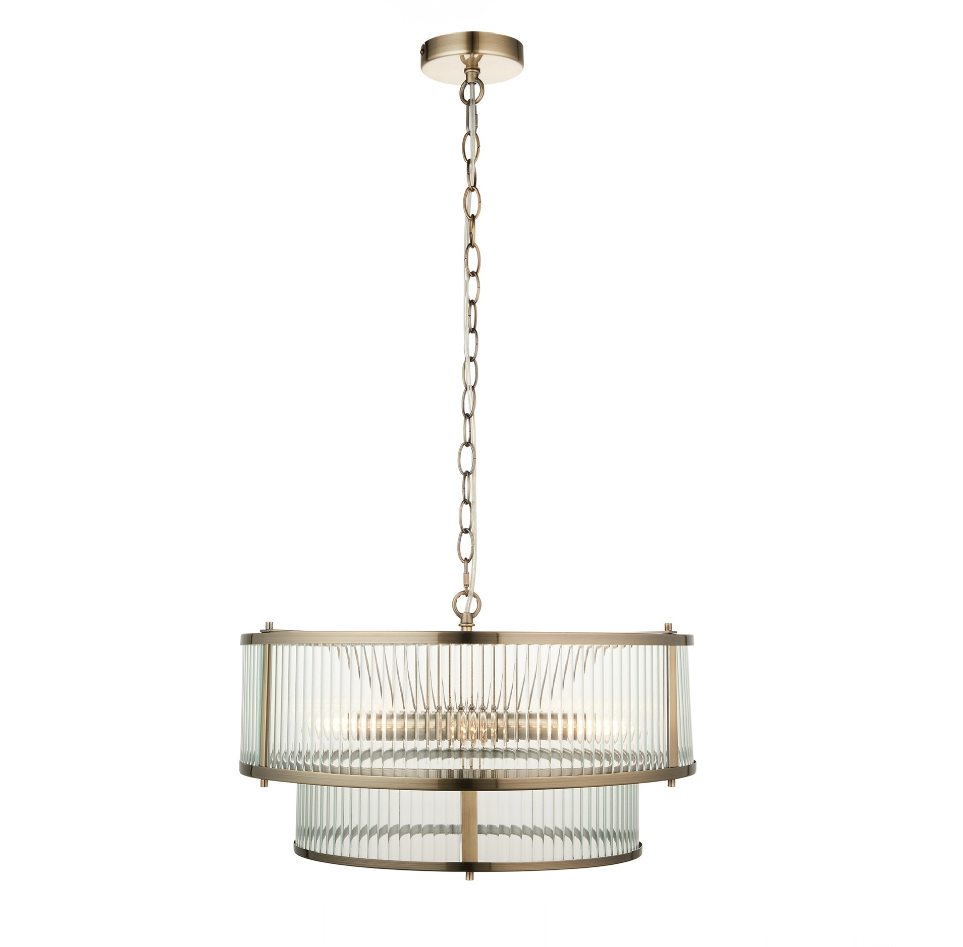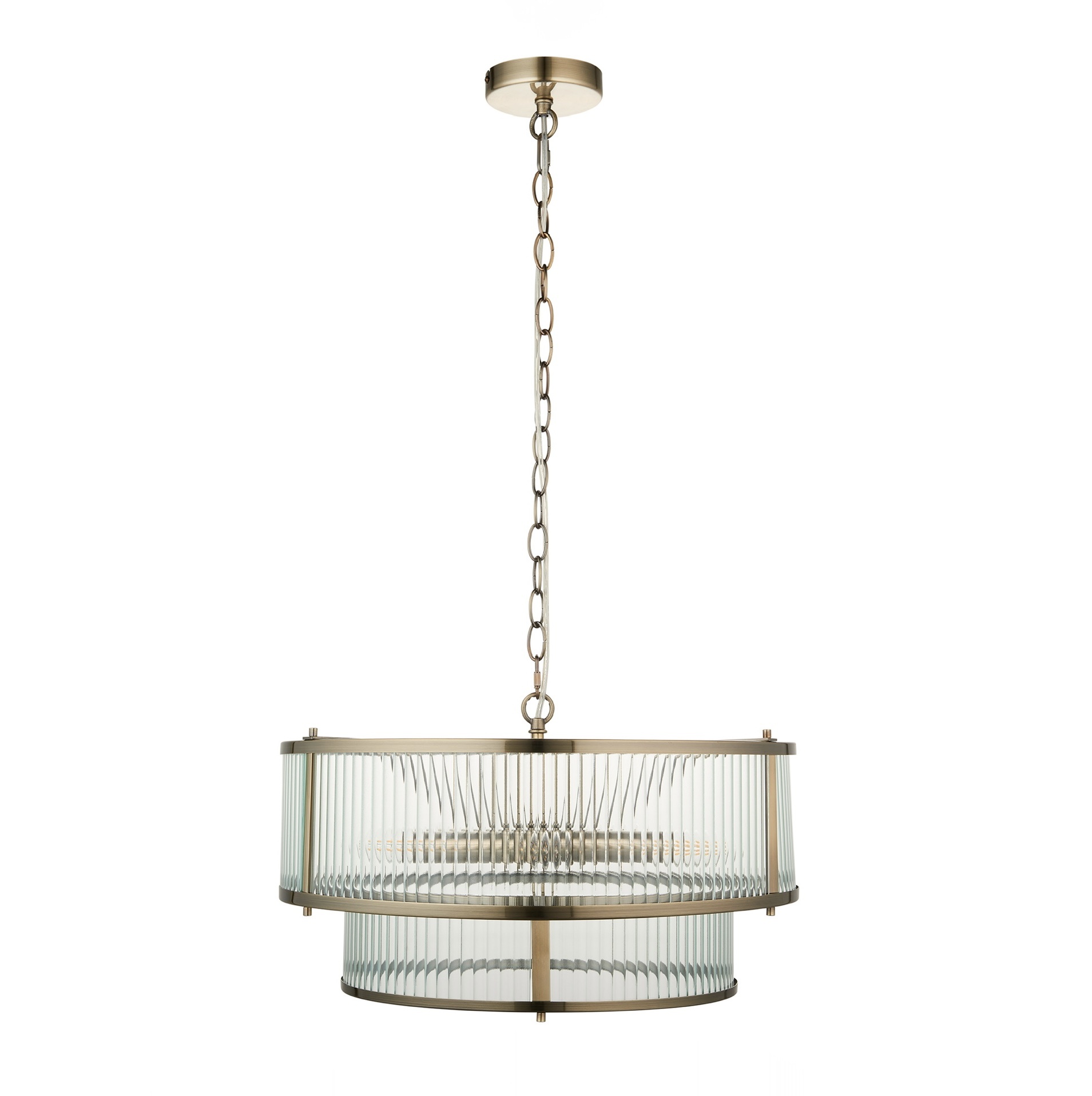 A timeless, classic pendant with antique brass plated metalwork, the clear ribbed glass panel shades beautifully diffuse the light.