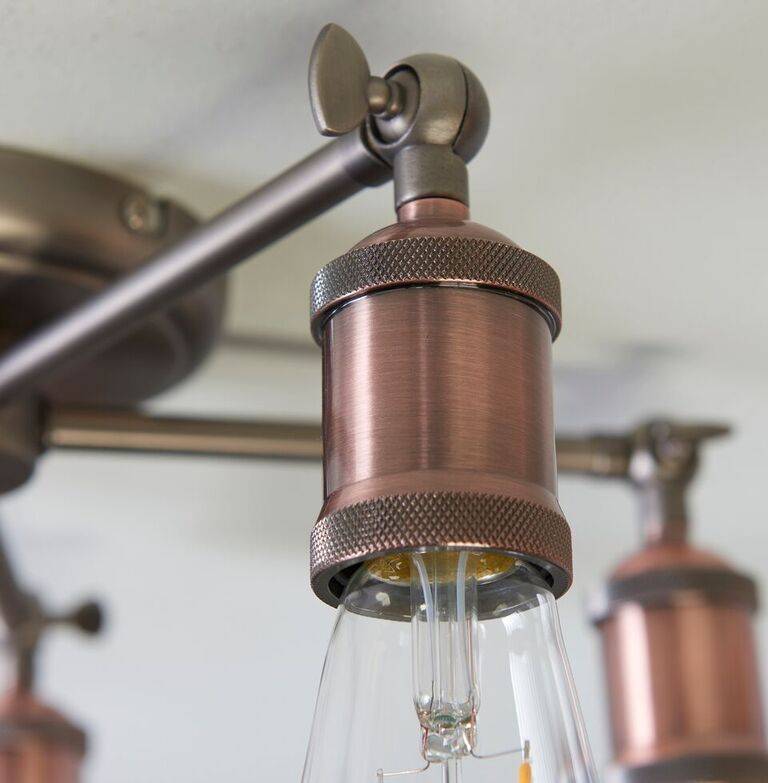 An industrial styled compact ceiling light, finished in aged pewter and aged copper, making it bang up to date with on-trend 'resto' styling. Adjustable knuckles and knurled lamp holders complete the authentic look. Compact design makes it perfect for low ceilings, perfect when paired with filament LED lamps.